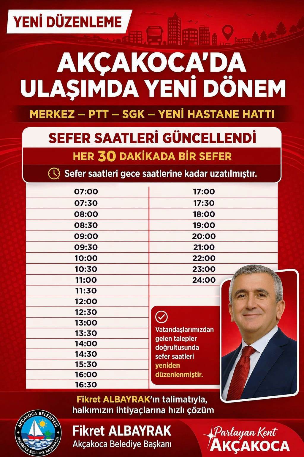 Akçakoca Belediyesi Ulaştırma ve Zabıta Müdürlüğü tarafından yapılan açıklamada ise, yeni sefer saatlerinin tüm vatandaşlara hayırlı olması temenni edilerek, sağlıklı ve güvenli yolculuklar dilendi.
