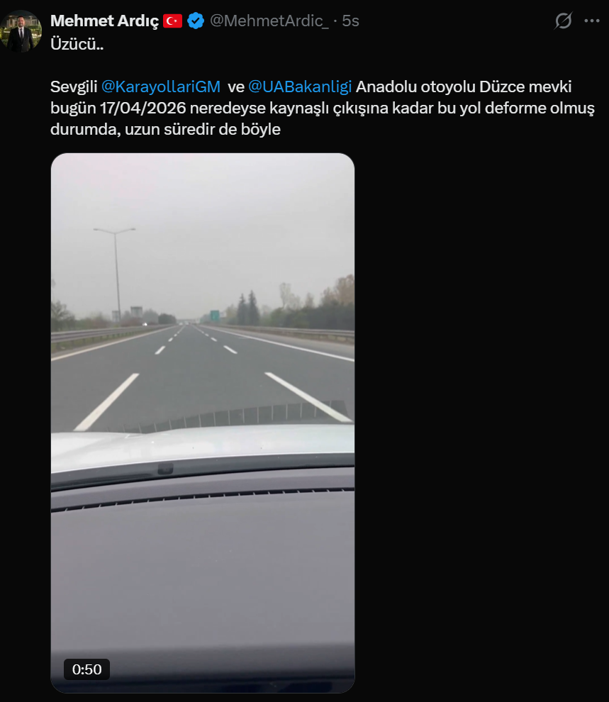 “Üzücü… Anadolu otoyolu Düzce mevki bugün 17/04/2026 neredeyse Kaynaşlı çıkışına kadar bu yol deforme olmuş durumda, uzun süredir de böyle.”