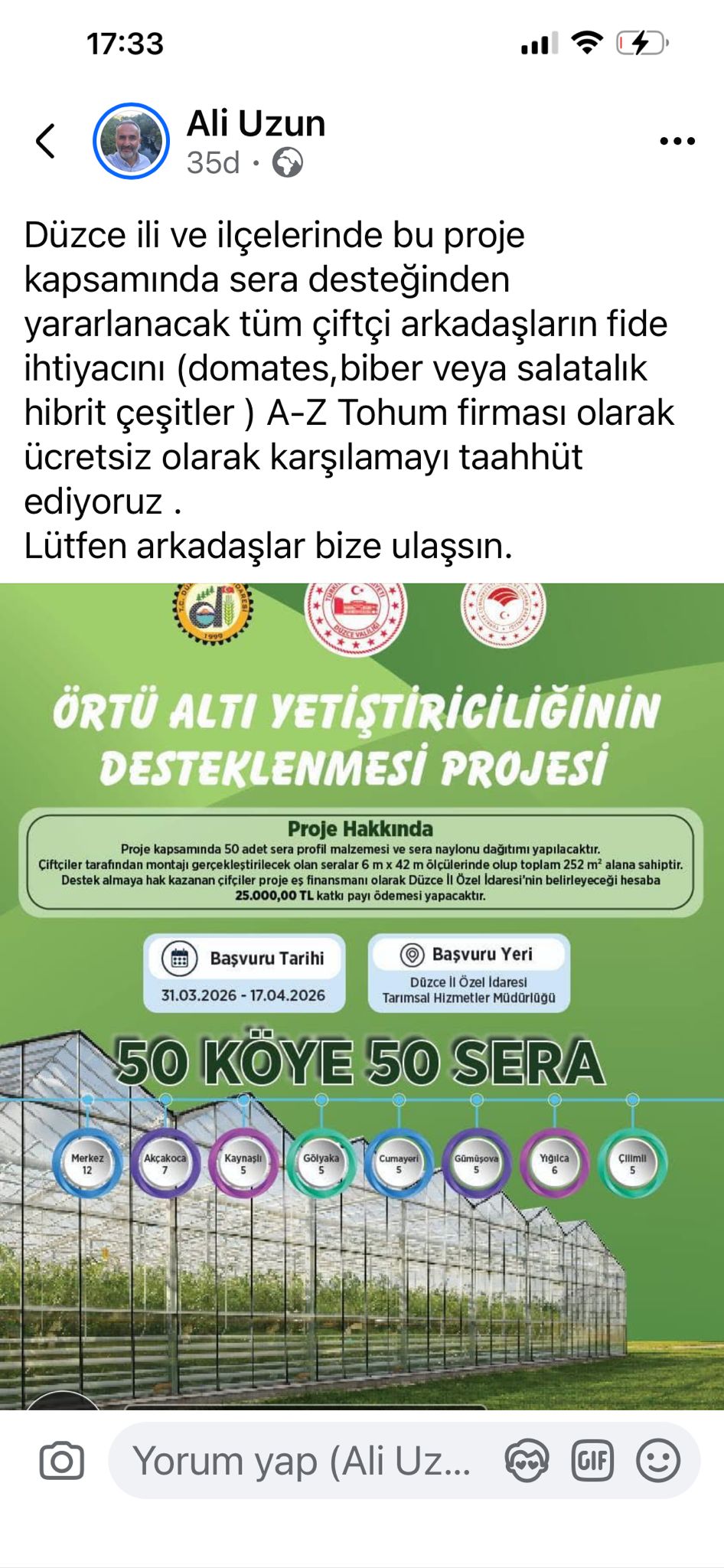 Düzce İl Özel İdaresi ve İl Tarım ve Orman Müdürlüğü iş birliğiyle hayata geçirilen "Örtü Altı Yetiştiriciliğinin Desteklenmesi Projesi" kapsamında, il genelindeki 50 köye 50 adet sera kurulacak. Proje kapsamında sera desteğinden yararlanacak tüm çiftçilerin fide ihtiyacını, Düzce tarıma verdiği büyük destekle bilinen A-Z Tohum firması ücretsiz olarak karşılamayı taahhüt etti.