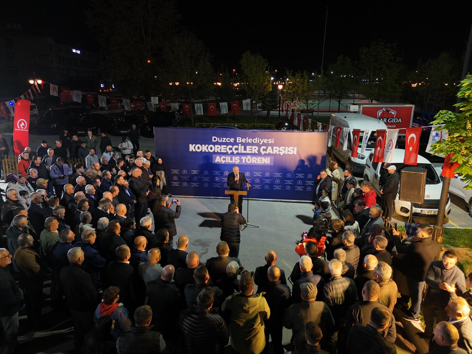 Törende konuşan Belediye Başkanı Dr. Faruk Özlü, kokoreççilerin daha önce Asar Deresi kenarında, fiziki koşulları yetersiz bir alanda hizmet verdiğini hatırlatarak, “Orası derme-çatma bir yerdi. Hijyen sorunları vardı, tuvalet ihtiyacı dahi tam anlamıyla karşılanamıyordu. Burayı taşımamız gerekiyordu. Burası gerçekten Düzce’nin merkezine makul mesafede olan bir yer. Belki de ilk defa bir gece açılışı yapıyoruz. Çünkü burası Kokoreççiler Çarşısı. Ben bu vesile ile bazı arkadaşlara teşekkür etmek istiyorum. Sayın Mehmet Habiboğlu’nun ve Nurhan Kartal’ın. Milli Emlak’ın yerinde bu tesisleri inşa ettik. Bu binaların yapımına katkı sağlayan arkadaşlarımıza teşekkür ediyorum. Düzce’mize hayırlı uğurlu olmasını diliyorum” dedi.
